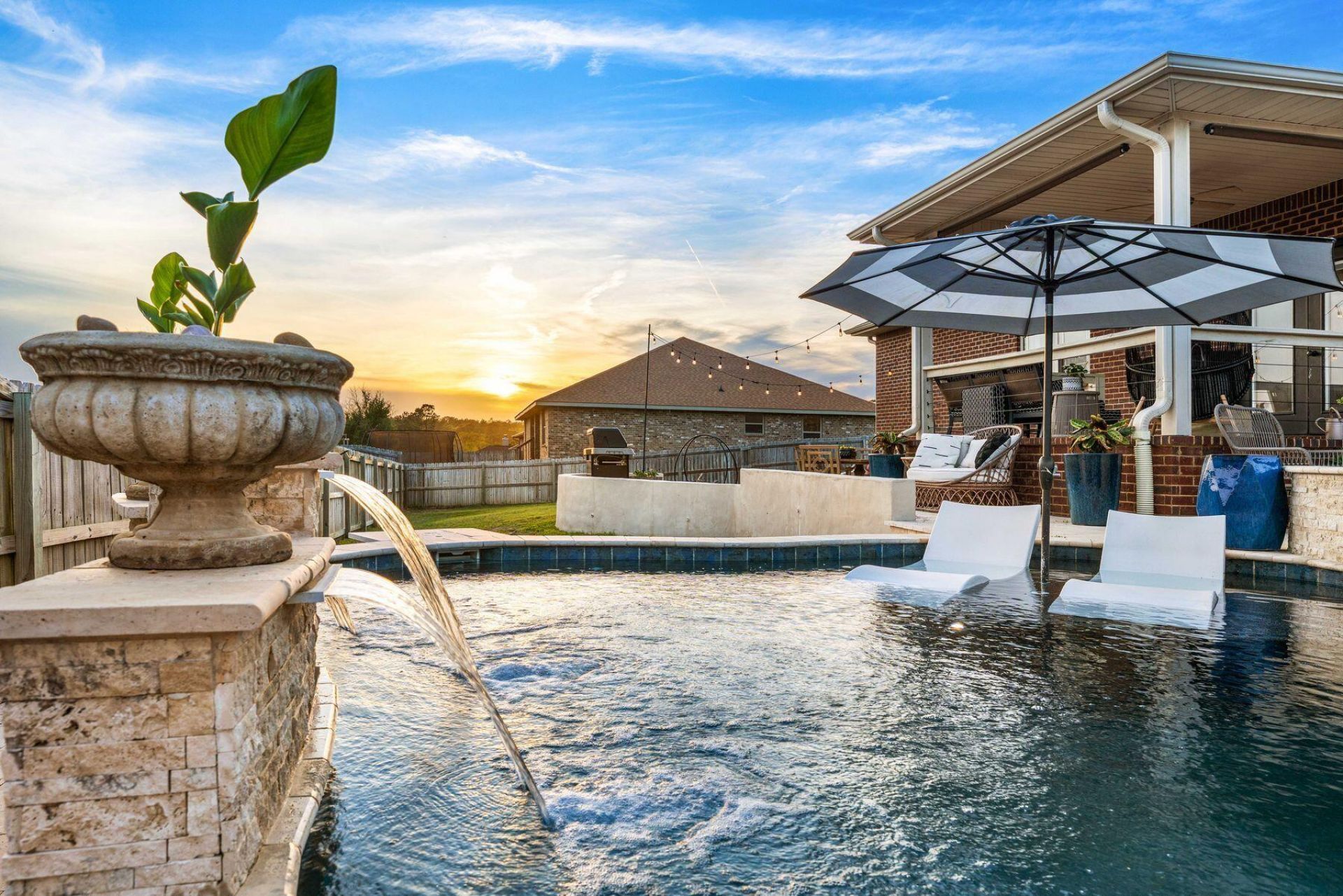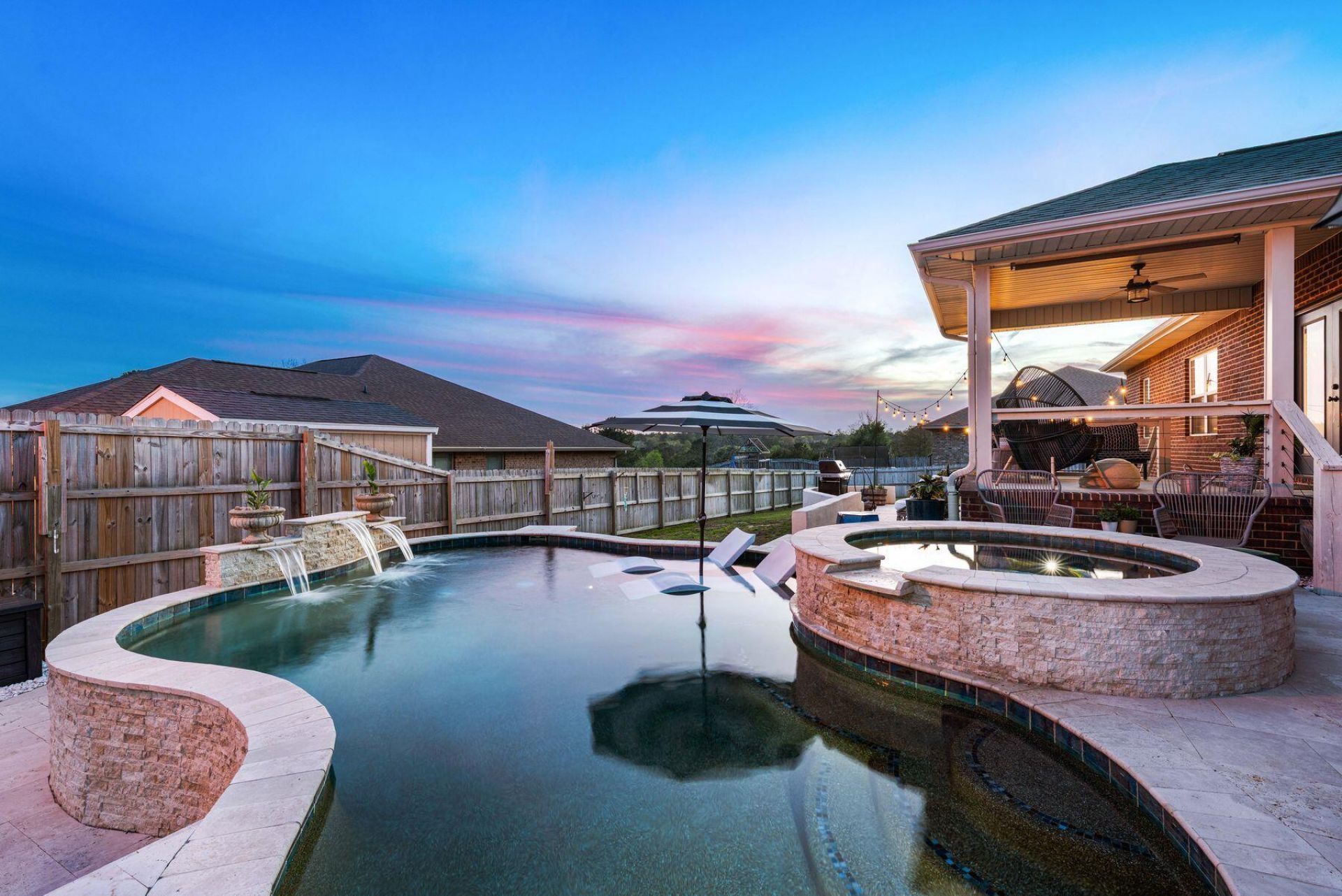 Under contract with kick-out clause and accepting back-up contracts. Set on a large 1/3 acre corner lot, this exceptionally maintained one-owner residence pairs classic all-brick construction with the kind of backyard experience that tends to steal the show. With a saltwater pool and heated spa, expansive travertine patio, bistro lighting, a generous deck and multiple seating areas, the outdoor living is as inviting by day as it is at sunset. Inside, the open floor plan is both comfortable and polished, anchored by a spacious family room with a tray ceiling and windows to the backyard. Arched openings and bullnosed granite countertops soften the main living and dining areas, while upgraded LVP flooring and stainless steel appliances bring a current finish to the home's thoughtful design. The kitchen is well equipped for everyday living and easy entertaining offering custom cabinetry and matching island, 20-inch tile, a pantry, breakfast bar and side-by-side refrigerator. Just beyond, the covered back porch extends the living space outdoors, while the covered front porch adds another welcoming place to sit and unwind. The primary suite features a tray ceiling, along with a spacious en-suite bath complete with double vanities, a garden tub, and a separate shower. Three additional bedrooms and a desirable split floor plan provide flexibility for guests, while an added office nook creates room for work, study or household organization. Both baths include granite countertops and custom cabinetry, and Cat 6 Ethernet in all bedrooms adds a practical, modern touch. A side-entry two-car garage with a large walk-in attic above, sprinkler system, professionally landscaped yard and 2025 water heater round out the home's long list of upgrades. Residents also enjoy neighborhood amenities, including a community pool and playground, adding even more appeal to this well-kept property.